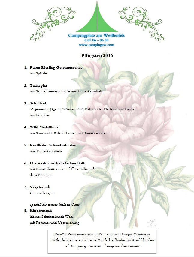 Pfingsten 2016Sarah13. Mai 20161 Min. LesezeitDas letzte mal die große Menükarte in diesem Frühjahr Wir machen uns schon Gedanken zu den Sommeraktionen und hoffen das Wetter hält über Pfingsten